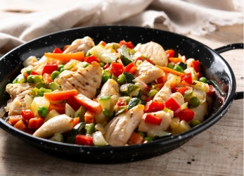 Pollo cocinado con zanahoria, pimiento y cebolla. Sabor tradicional, listo en minutos.